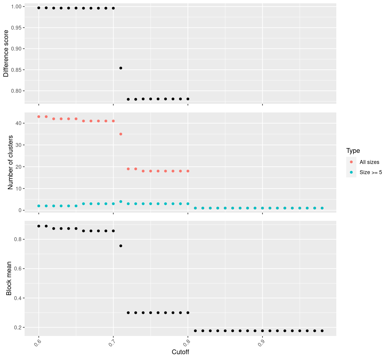 Figure 2. Compare clustering results. Top left panel: Similarity heatmap with clusterings from different methods. Bottom left panel: Concordance between clustering methods. The concordance measures how similar two clusterings are. Right panel: The difference score, number of clusters and the block mean of different clusterings.