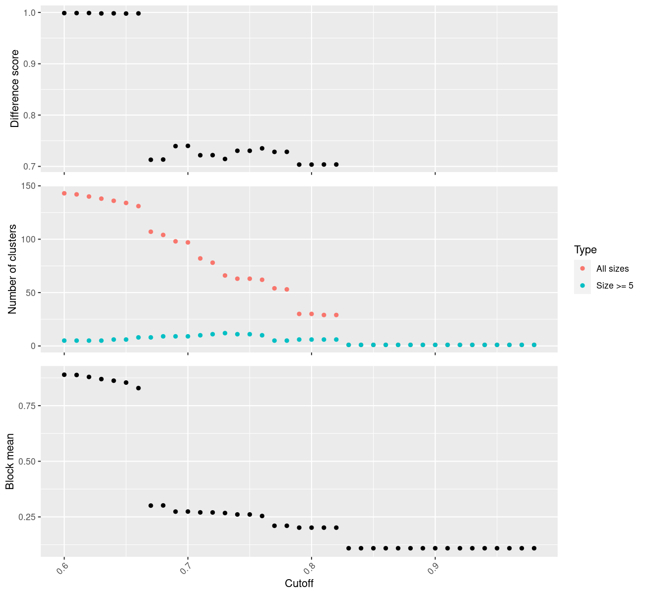 Figure 2. Compare clustering results. Top left panel: Similarity heatmap with clusterings from different methods. Bottom left panel: Concordance between clustering methods. The concordance measures how similar two clusterings are. Right panel: The difference score, number of clusters and the block mean of different clusterings.