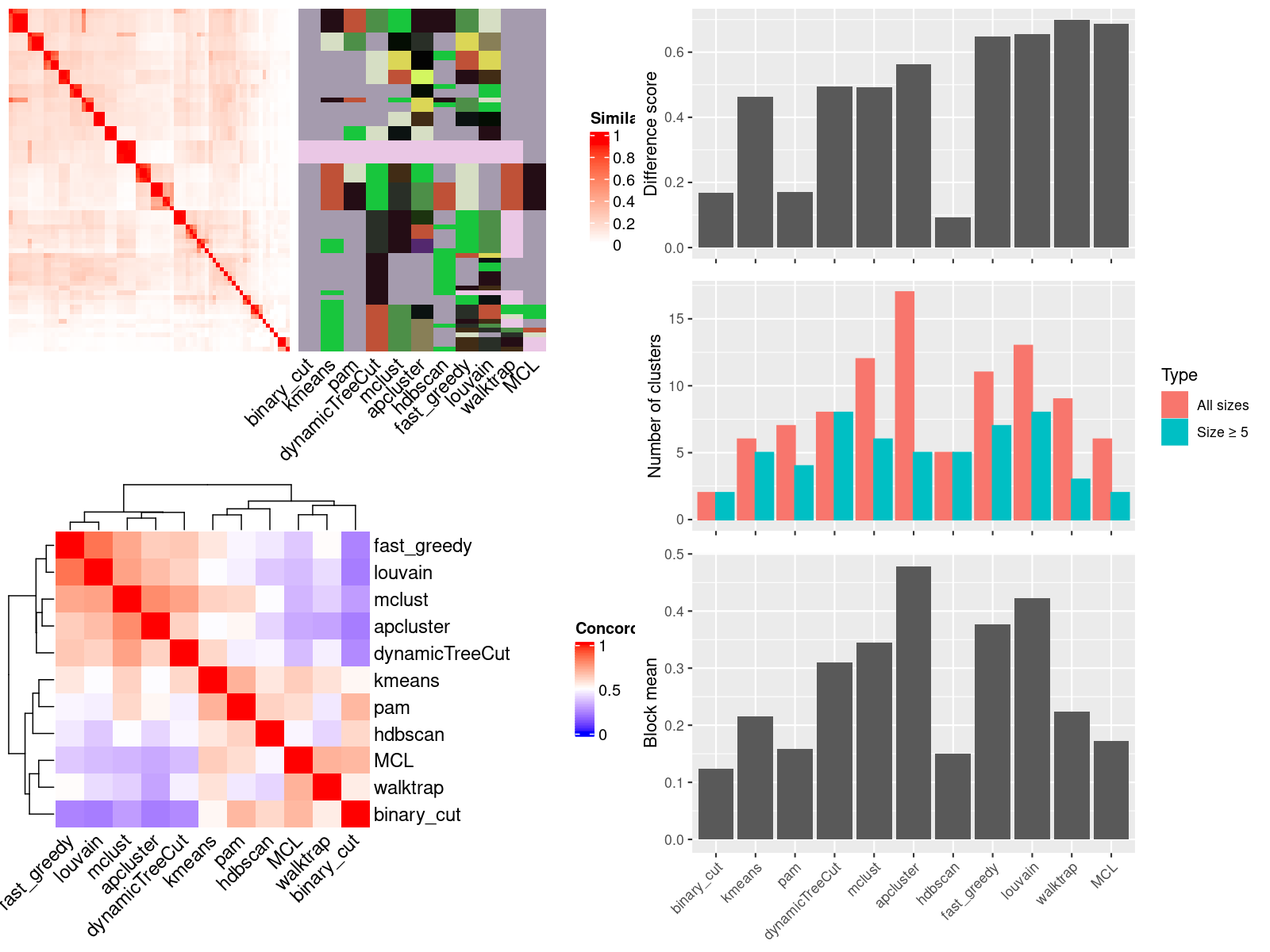 Figure 2. Compare clustering results. Top left panel: Similarity heatmap with clusterings from different methods. Bottom left panel: Concordance between clustering methods. The concordance measures how similar two clusterings are. Right panel: The difference score, number of clusters and the block mean of different clusterings.