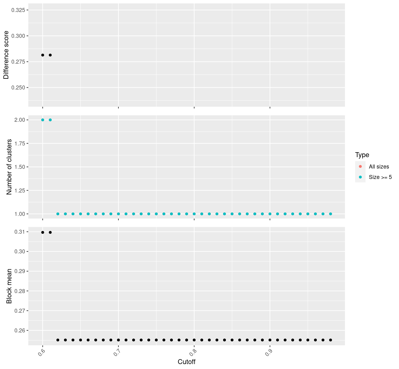 Figure 2. Compare clustering results. Top left panel: Similarity heatmap with clusterings from different methods. Bottom left panel: Concordance between clustering methods. The concordance measures how similar two clusterings are. Right panel: The difference score, number of clusters and the block mean of different clusterings.