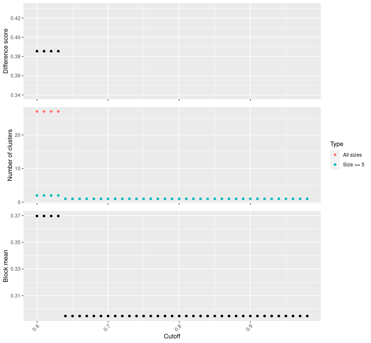 Figure 2. Compare clustering results. Top left panel: Similarity heatmap with clusterings from different methods. Bottom left panel: Concordance between clustering methods. The concordance measures how similar two clusterings are. Right panel: The difference score, number of clusters and the block mean of different clusterings.