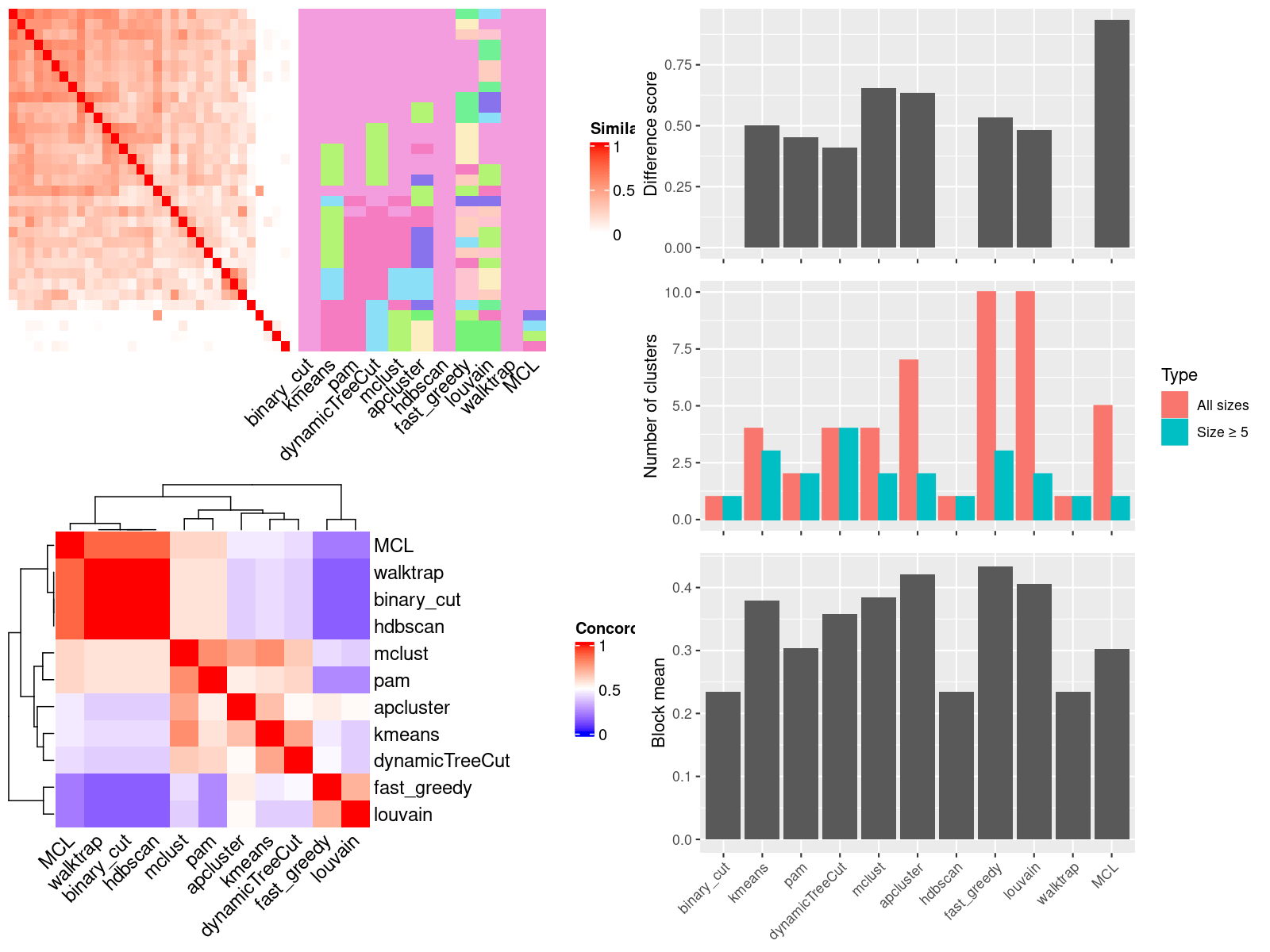 Figure 2. Compare clustering results. Top left panel: Similarity heatmap with clusterings from different methods. Bottom left panel: Concordance between clustering methods. The concordance measures how similar two clusterings are. Right panel: The difference score, number of clusters and the block mean of different clusterings.
