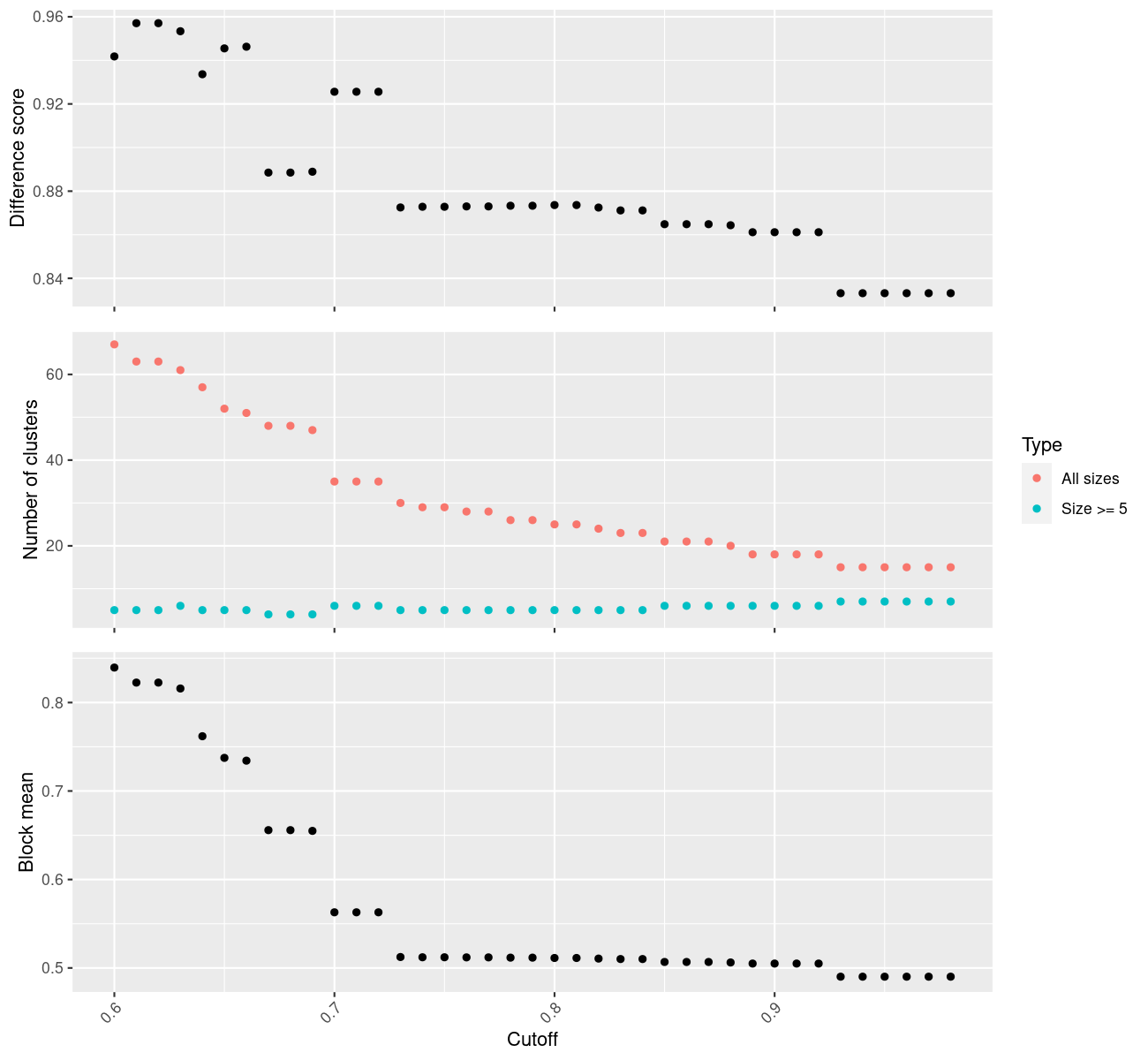Figure 2. Compare clustering results. Top left panel: Similarity heatmap with clusterings from different methods. Bottom left panel: Concordance between clustering methods. The concordance measures how similar two clusterings are. Right panel: The difference score, number of clusters and the block mean of different clusterings.
