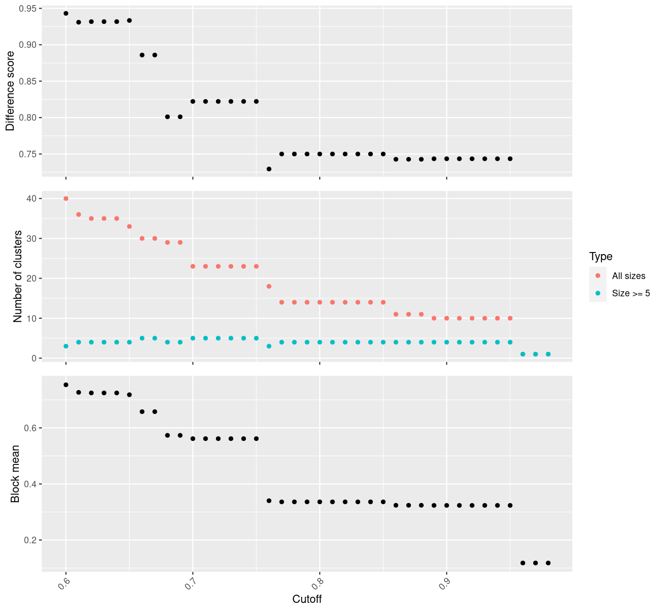 Figure 2. Compare clustering results. Top left panel: Similarity heatmap with clusterings from different methods. Bottom left panel: Concordance between clustering methods. The concordance measures how similar two clusterings are. Right panel: The difference score, number of clusters and the block mean of different clusterings.